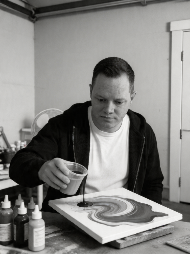 I’m new to this. The studio is nothing fancy, a work surface, a set of tilted canvases, and a growing collection of paint I’ll never fully get off my hands. I came to acrylic pouring the way a lot of people come to something they end up loving: almost by accident, and at a moment when I needed it.